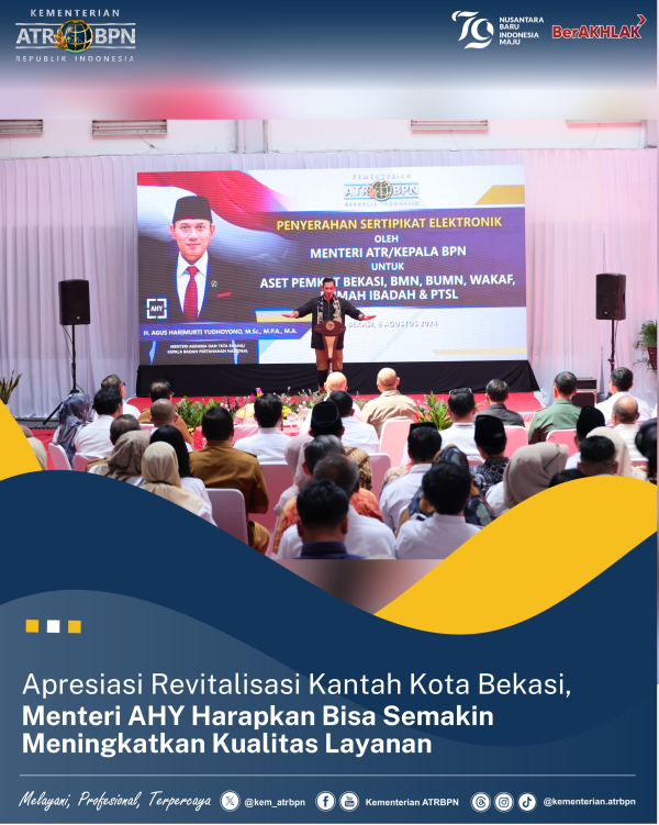 Kota Bekasi - Menteri Agraria dan Tata Ruang/Kepala Badan Pertanahan Nasional (ATR/BPN), Agus Harimurti Yudhoyono (AHY) mengapresiasi inovasi yang dilakukan Kantor Pertanahan (Kantah) Kota Bekasi u... Selengkapnya